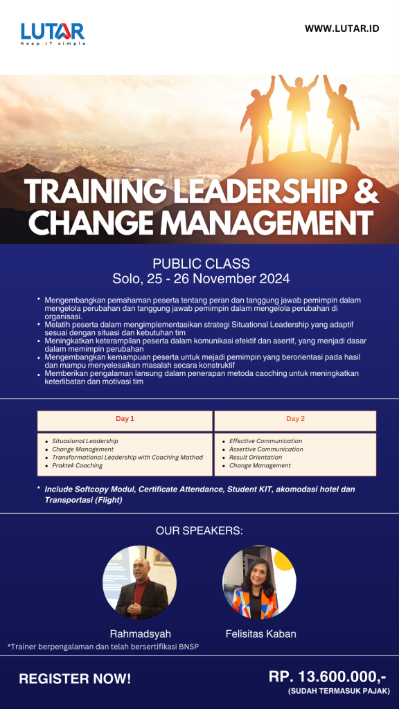 Akan dibuka kelas reguler untuk materi leadership & change management di bulan November ini, yuk daftar segera, sebelum kehabisan seat nya…